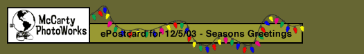 ----------------------------------------------------------- If the image(s) and navigation above are not showing up, you can view the epostcard online at http://www.mccartyphotoworks.com/epostcard/epostcard_031205.html Images, logos, and content ©2003 McCarty PhotoWorks - All Rights Reserved |