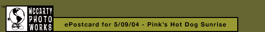 Pink's Hot Dog Sunrise It seems like I've had a lot of late nights the last month. From midnight shoots to some tight deadlines, it's been common to look up and see the coming sunrise. Usually that's my cue to pack it in and grab a few hours of sleep, but this morning I decided it was time to take a break from assignments and have some fun. I hope you enjoy the result above. The photo was taken at the usually very crowded Pink's hot dog stand on La Brea. Funny enough the only person there this morning was a homeless woman that felt I needed to have a condom (thankfully, in the wrapper). At least I think that was her motivation. Otherwise, I can't explain why she kept throwing the thing at us. A thanks worth noting is to my friend Michael that achieved sainthood by being coaxed out to help me this morning. Breakfast at IHOP really doesn't repay getting up at 5:15 on a Sunday morning to help an eccentric friend, so send the man some good thoughts. As always, there are million things going on with the studio. June and July are going to be very big months with a lot of things hitting all at once. Stay tuned for updates and even another chance to win a one-of-a-kind photo from McCarty PhotoWorks and some new promotional partners! Best